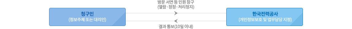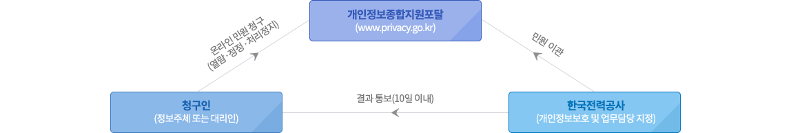 - - 제1항에 따른 권리 행사는 『개인정보보호법』시행규칙 별지 제8호 서식을 이용하여 방문, 서면, 전화, 전자우편, FAX를 통해 요구하거나 “개인정보보호 종합지원 포탈” 홈페이지 (www.privacy.go.kr, “개인정보 열람․정정․삭제․처리정지 요구”) 등 다양한 방법을 통하여 요구할 수 있으며, 공사는 신청자의 신분을 확인 후 지체없이(10일 이내) 조치하겠습니다.